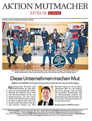 Die Möglichkeiten dieses Instruments hat auch die "Mutmacher 2021"-Jury überzeugt. Wirtschaftskammer NÖ-Präsident Wolfgang Ecker übergab gemeinsam mit dem Fachgruppenobmann des NÖ Güterbeförderungsgewerbes Markus Fischer die Mutmacher-Trophäe an Brandstätter.